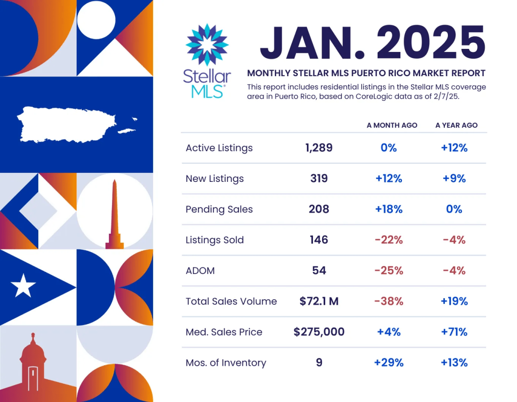 We do not have MLS stats for the city of San Juan, but we can review the stats for all of Puerto Rico for January 2025. Active listings have increased by 12% over this time a year ago, with 1289 homes for sale currently. New listings have increased almost the same amount over a year ago, as well as over the past month. Sales have dropped by 22% over the past month, which is leading to more of a buyer’s market. This is supported by a 9 month supply of inventory. It is a great time to make a purchase in Puerto Rico, where the median price is $275,000.