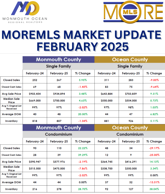 Fair Haven NJ’s median price of $1,325,000 (according to Realtor.com) is higher than the Monmouth County average in February 2025. This is due in part to a low inventory currently listed– 11 in the whole town on the market. We’re unable to determine other stats local to Fair Haven itself, since the below is regional by county. Fair Haven remains in a strong seller’s market, even with the average days on market increasing.