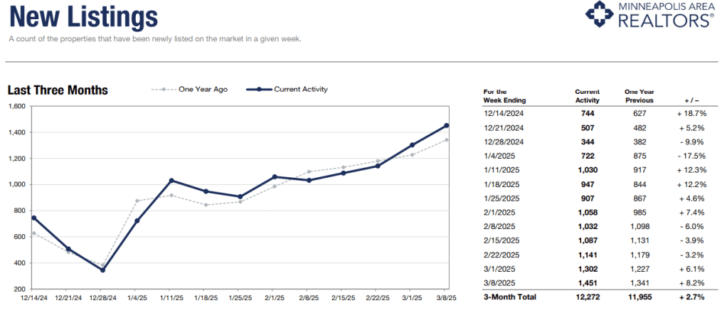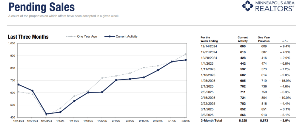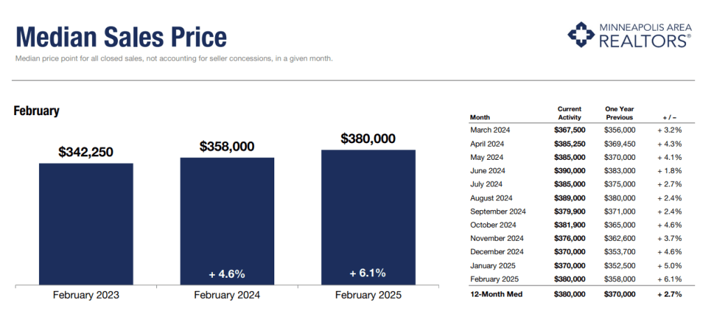 New listings in Minneapolis have increased sharply week over week for the past 3 months. Pending sales has followed the same trend, which has led to a steady amount of inventory, neither increasing nor falling. Median home prices have increased to $380,000 in February 2025, a 6.1% increase compared to a year prior.