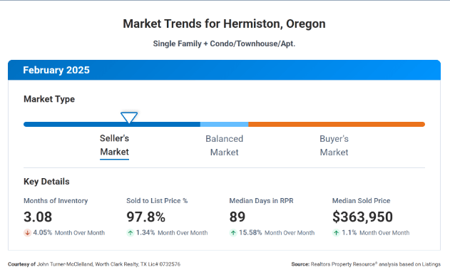 Market indicators suggest that Hermiston is transitioning, or has transitioned into, a sellers market. With median sold prices rising, and homes selling relatively quickly. The city is experiencing an increase in home values, and there is a lot of building happening. It is important to note that the market can be very localized, and those looking to buy or sell, should consult with local real estate professionals.
