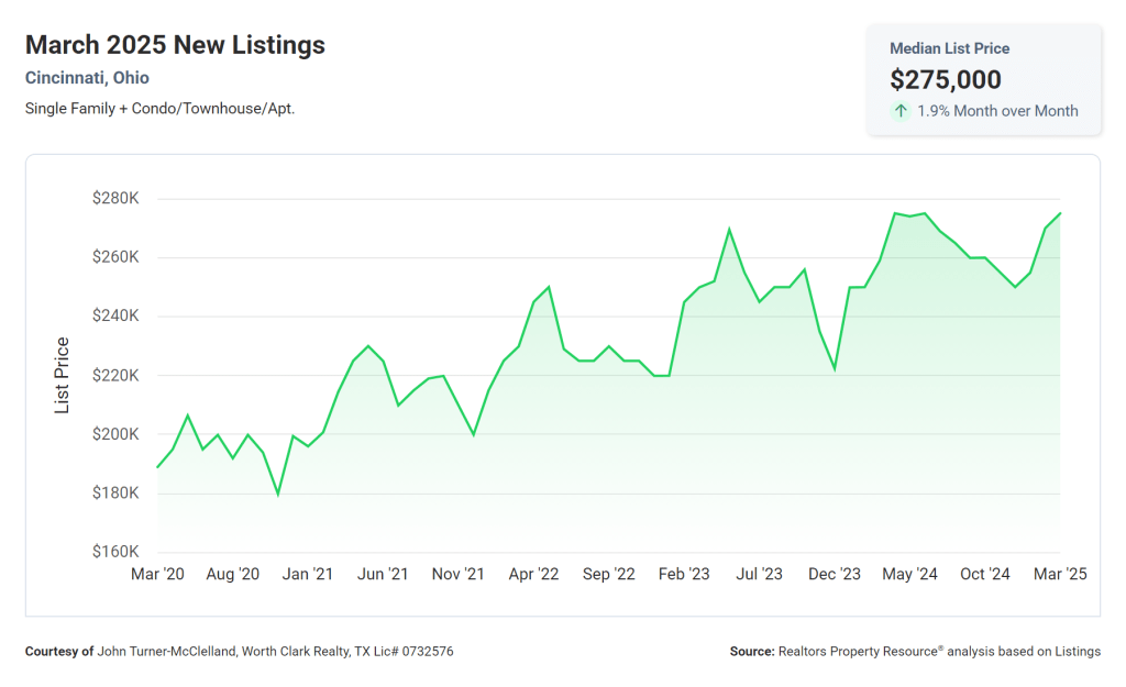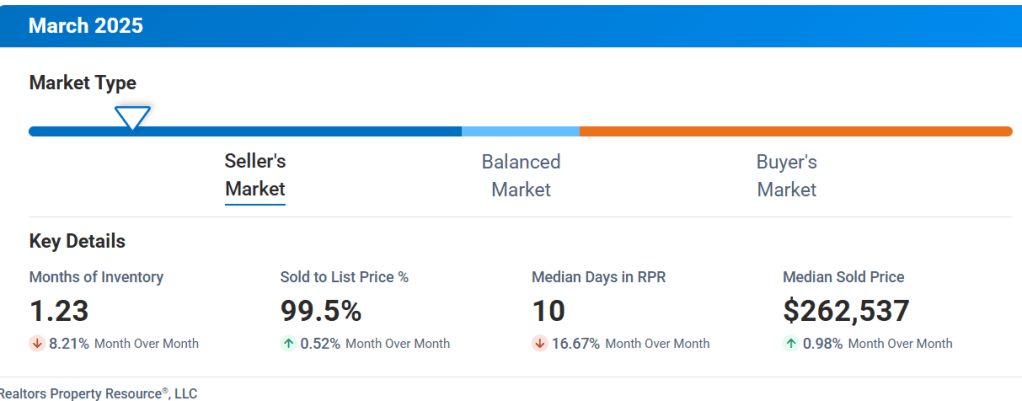 Cincinnati Ohio continues to show a strong seller’s market, with only 1.23 months of inventory on the active market and only 10 days on market on average. A median list price of $275,000 still makes the market affordable for most buyers, even though it has increased again in March 2025.
