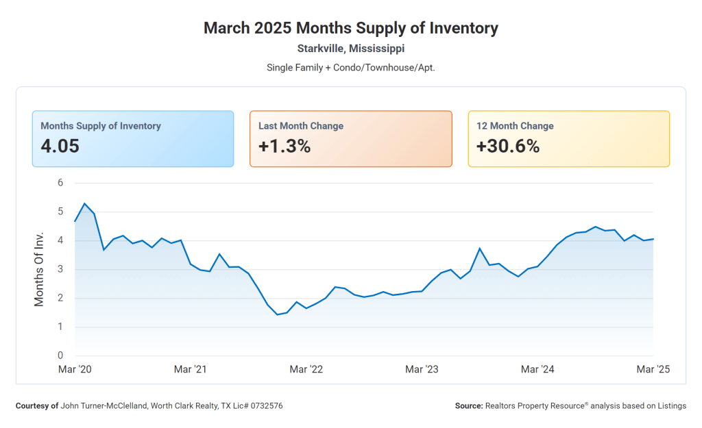 The median sold price in Starkville is still a healthy $295,000, even though it dropped from the prior month. Months of supply remains above 4 months, which is still signaling a seller’s market despite the drop in sold price compared to the median list price of $399,000.