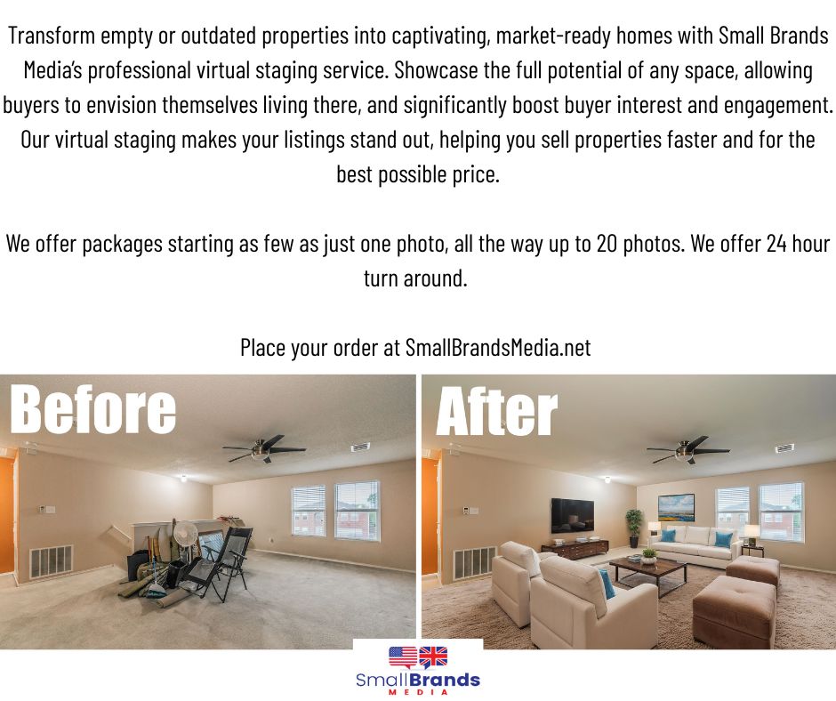 Transform empty or outdated properties into captivating, market-ready homes with Small Brands Media’s professional virtual staging service. Showcase the full potential of any space, allowing buyers to envision themselves living there, and significantly boost buyer interest and engagement. Our virtual staging makes your listings stand out, helping you sell properties faster and for the best possible price.
